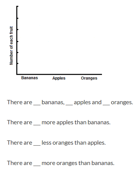 there are 6 apples,2 bananas.there is 1 less orange the apples.There are 3 more oranges the bananas